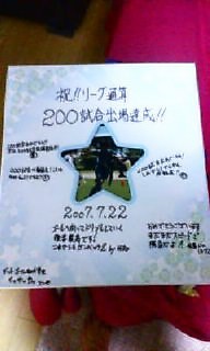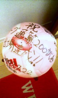 新潟戦の出場で、美都りんはリーグ通算200試合出場達成しました。 記念に、ピンクのロテイログライダーに寄せ書きし、真ん中に★型の写真入れのある色紙に寄せ書きして、試合後渡しましたが・・・写真を撮るのをわすれた・・・(^o^; ピンクは美都りんの好きな色と聞いたのと、昔、星が好きと本人から聞いた事があったので・・・